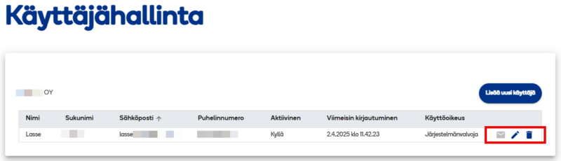 Käyttäjähallintanäkymässä on lista yrityksen kaikista käyttäjistä. Listalla näkyy käyttäjän perustietoa, käyttöoikeustaso ja viimeisimmän kirjautumisen ajankohta. Oikeassa reunalla käyttäjän tietojen vieressä näkyy 3 pientä kuvaketta, joilla on seuraavanlaisia toiminnallisuuksia:
