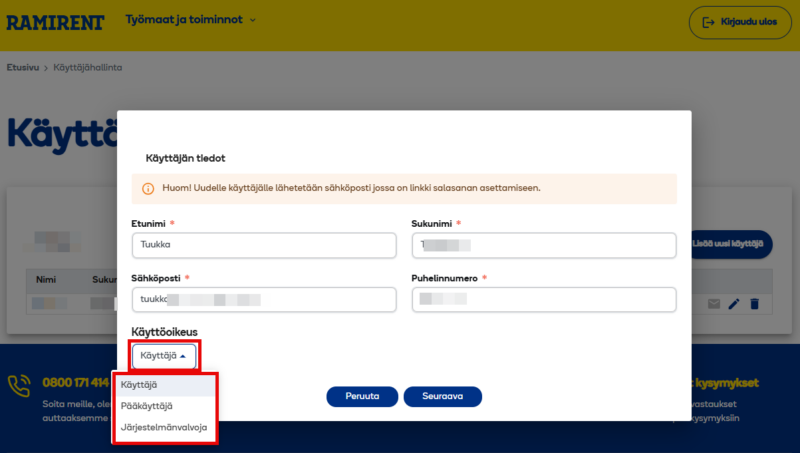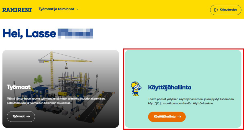 Ramirentin asiakasportaalissa yritys pystyy itse hallinnoimaan omat käyttäjänsä ”Käyttäjähallinta”-toiminnallisuuden kautta. Käyttäjähallintaan on pääsy vain yrityksen järjestelmänvalvojilla. Järjestelmänvalvoja voi luoda yritykselle uusia käyttäjiä ja määrittää heille käyttöoikeustason sekä poistaa ja muokata olemassa olevia käyttäjiä.