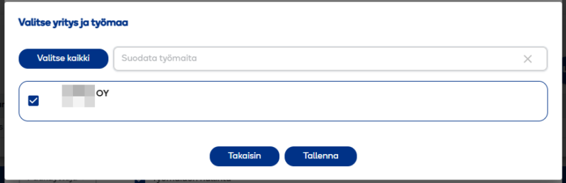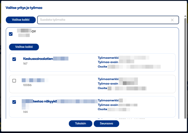 Kun perustiedot on täytetty, klikataan ”Seuraava”-nappia. Seuraavassa näkymässä valitaan asiakasnumero ja sen alta löytyvät työmaat. Kun halutut työmaat on valittu, klikataan ”Seuraava”-nappia.