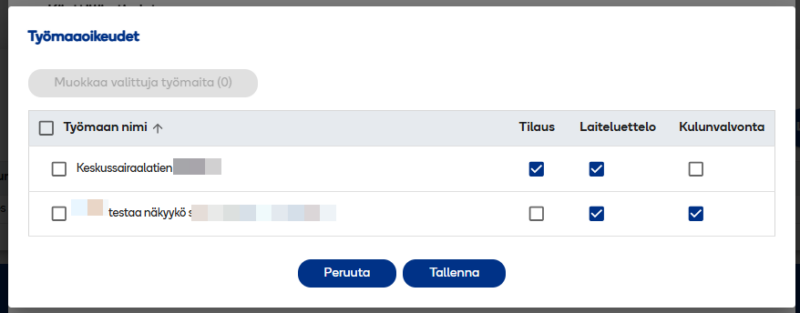 Seuraavassa näkymässä valitaan aikaisemmin valituille työmaille käyttäjälle halutut työmaakohtaiset käyttöoikeudet. Kun nämä ovat valittuna, klikataan tallenna. Uudelle käyttäjälle lähtee tallentamisen jälkeen sähköpostiin viesti, jossa on linkki rekisteröitymistä varten.
