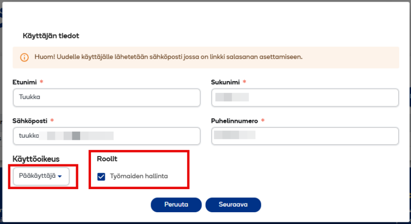 Kun lisätään uusi Pääkäyttäjä, täytetään perustiedot samanlailla kuin aiemmassa esimerkissä, mutta käyttöoikeustasoksi valitaan ”Pääkäyttäjä” ja Rooleiksi ”Työmaiden hallinta”. Sen jälkeen klikataan ”Seuraava”-nappia.