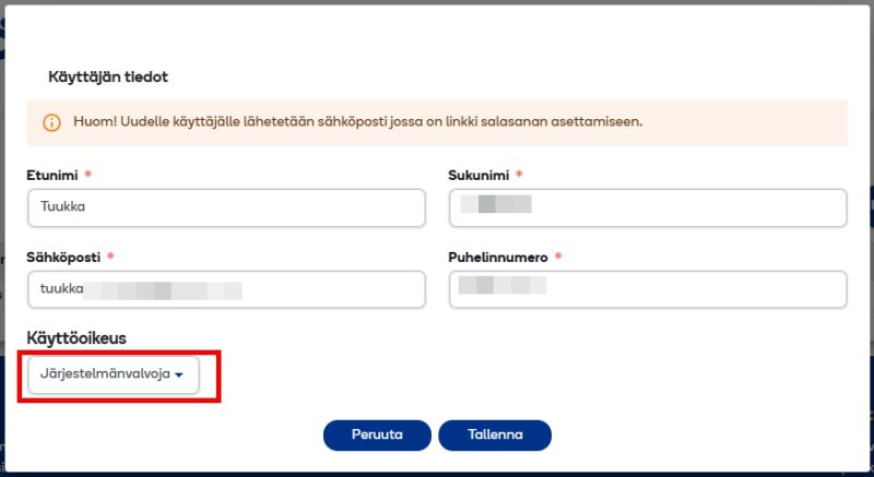 Kun lisätään uusi Järjestelmänvalvoja, täytetään perustiedot, valitaan käyttöoikeustasoksi Järjestelmänvalvoja ja lopuksi klikataan ”Tallenna”-nappia. Uudelle käyttäjälle lähtee tallentamisen jälkeen sähköpostiin viesti, jossa on linkki rekisteröitymistä varten.