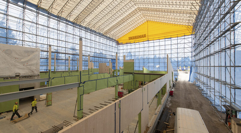 Pääurakoitsija SRV:llä on tällä hetkellä työmaalla meneillään runkovaihe. Puurunko tehdään CLT-elementistä (Cross Laminated Timber), ja sen pystytys tapahtuu kokonaan sääsuojan sisällä aina siihen asti, kunnes vaippa on ummessa ja katto vedenpitävä. Asennus, purku ja nostot hoidetaan Hiabeilla, joita varten sääsuojan sisällä on ajoväylät rakennuksen sivuilla. Työmaata esittelevät SRV:n työmaapäällikkö Marko Klippi ja projekti-insinööri Henri Kiviranta.
