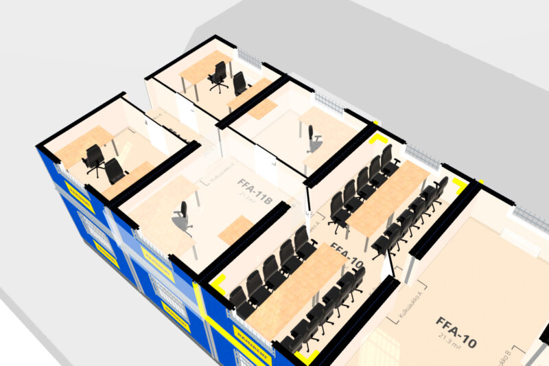 Flexibel basmodul som kan möbleras för olika ändamål. Kommer med öppet kontorslandskap, dockningsbara fönsterbänkar samt förelektriska installationer.