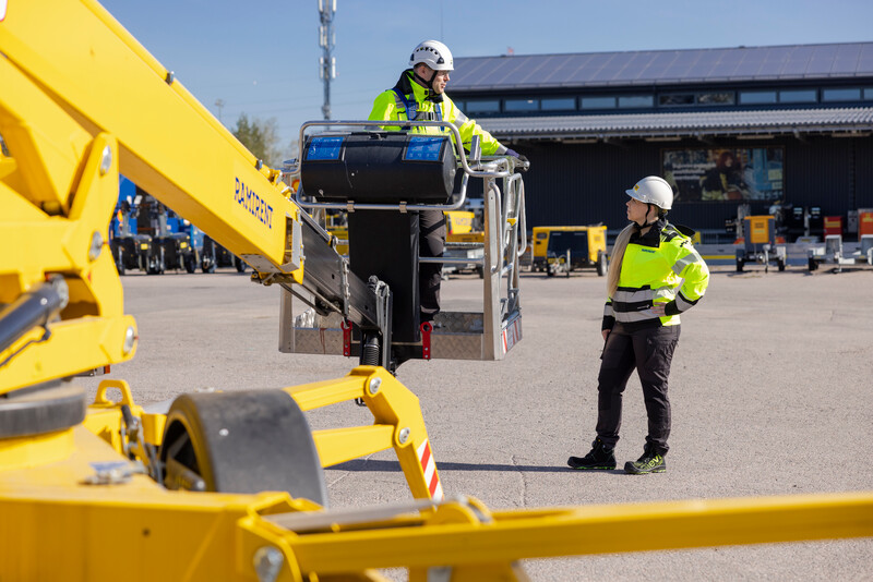 Kaksi henkilöä keskustelee nostimen korin luona.