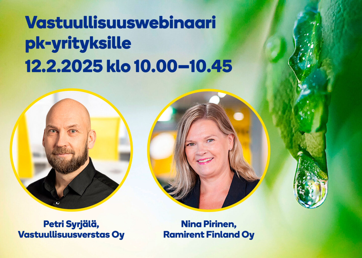 Pk-yrittäjä! Osallistu maksuttomaan webinaariimme 16.9.2025 klo 10.00–10.45. Se on suoraa jatkoa alkuvuoden webinaarillemme Vastuullisuus pk-yrityksen kilpailuetuna – näin aloitat. Voit katsoa edellisen webinaarin tallenteen ennen h-hetkeä.